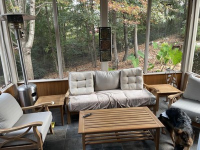 We are loving our teak patio furniture set - very pretty and comfortable! The only feedback is on one of the chair backrests, the construction is a bit off and the middle slots are not lined up, causing some wobbling when all the screws are tightened.