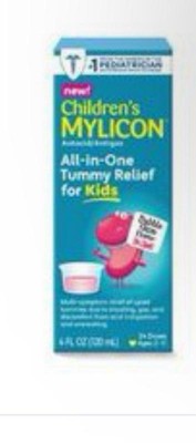 New Children’s Mylicon Tummy Relief For Kids All-in-One liquid, quickly relieves multiple symptoms of tummy discomfort for kids ages 2 to 11. Children's Mylicon is fast-acting, now in a great tasting bubble gum flavor. In addition to gas and bloating, Children’s Mylicon helps relieve acid indigestion, heartburn, and discomfort from overeating. Children’s Mylicon liquid contains simethicone, like our #1 doctor-recommended gas drops, in addition to an antacid called calcium carbonate. Children's Mylicon Tummy Relief starts to work on contact to neutralize acid and fight gas, so your child feels better quickly.