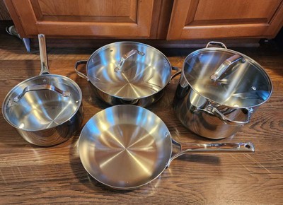 Recently transitioned to full stainless steel and this set was a great starter kit. These look and feel expensive. I have enjoyed cooking with them and they have held up well. Have been using the pink stuff to clean them and they have stayed looking new.