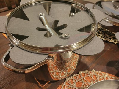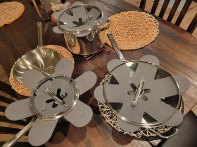 I like the idea of stainless steel pots and pans because you are not accidentally ingesting Teflon with your food. The upside of this set is that they re thick and come in various sizes with lids and even one with measurements on the inside. Also n upside is that they do heat up quickly. The down size is that they do become extremely hot and I wish that they had heat resistant rubber handles on the pot/pans lids because you can easily burn your hands when cooking and even while washing them with hot water. The set did come with some dividers for when stacking them for storage and it works out really well.