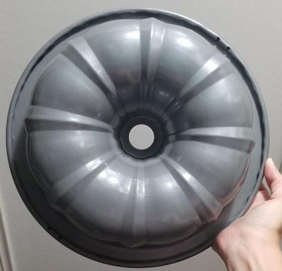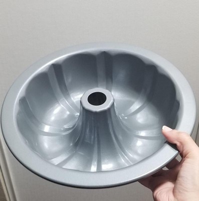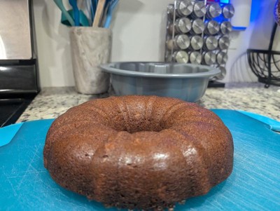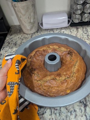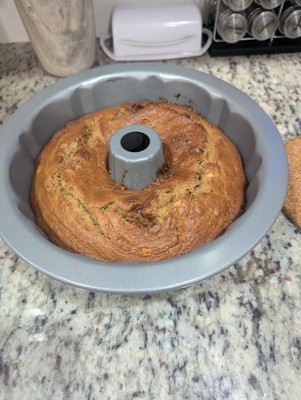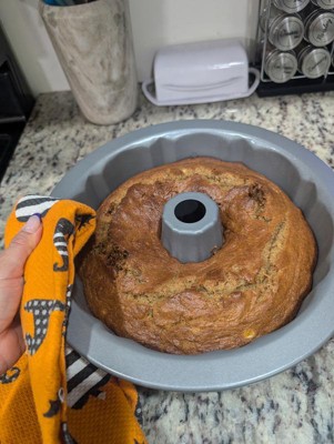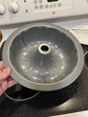 I really love a good bundt pan. This bent pan is non-stick carbon steel. And everything slides right out of it. I have used it several times and have not had any issues with it sticking at all. I make sure that I wash it immediately and dry it off and not put it in the dishwasher and not leave it sitting with water in it. It holds 12 cups of baking mix whatever it is you're baking in it. You can bake a regular cake or a cookie cake or you can even make a rice crispy cake in here. This Bundt pan has many many uses. I have even made a meatloaf in it.