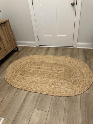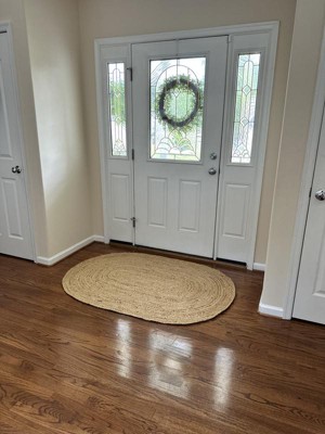 Arrived quickly, looks quite nice, and the oval shape is a fun option. It's a bit thinner than other jute rugs I have had, but it works since the door needs to easily go over it.