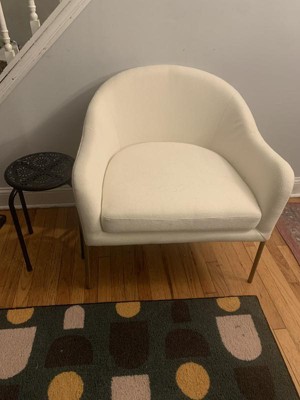 This barrel chair is a super nice neutral to fit into any part of your home. The base is quite wide so it’s easy to curl up in the chair if you’re someone who likes to curl up. The textured finish makes it stand out and the golden bronze legs are a nice touch. It’s VERY comfortable!