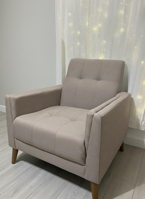 [This review was collected as part of a promotion.] I’ve been looking for that perfect Mid-Century Modern vibe, and this armchair is a perfect match. The clean lines and tufted faux linen give it a really sophisticated look. It doesn’t look like "cheap" furniture; the solid wood legs actually feel premium and give it a nice, grounded aesthetic. It fits perfectly in a reading nook, living room or even a nursery, but because it's commercial grade, I’m not worried about it wearing out if guests are constantly sitting in it. It’s not one of those "sink-in-and-disappear" chairs. The pocket springs make it feel supportive and firm—great for sitting and chatting or working on a laptop. It feels incredibly sturdy. It’s rated for 300 lbs, and you can tell the frame isn't just flimsy particle board. Huge shoutout for the floor glides, it’s nice not having to worry about scratches every time someone shifts the chair. Assembly was very easy, they said under 30 minutes, and they weren’t kidding. It was straightforward and didn't require any special tools or knowledge. The removable back cushion is a lifesaver for vacuuming crumbs, though the seat cushion is attached (stays tidy, but no flipping it). A damp cloth takes care of most spots on the faux linen. If you want a chic, durable chair that looks more expensive than it actually is, this is a winner.