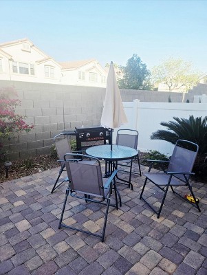 We wanted a small table and chairs set for our back deck. This was definitely worth the price since we got it on sale! The chairs fold up very thin so they are easy to store when not in use. The table came with a plastic piece in the center, so when you aren’t using the umbrella it looks like a full glass table. Assembly was easy once I figured it out. The instructions are only pictures and they aren’t that good so I was a little confused at first.