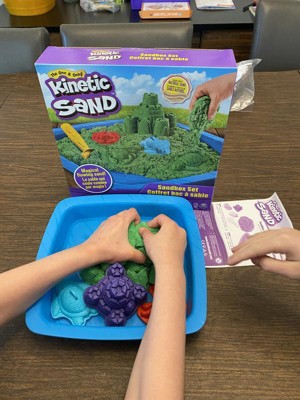 [This review was collected as part of a promotion.] I received the Kinetic Sand Sandbox Set for my four-year-old daughter. The set we received included one pound of green kinetic sand, the box, a shovel, a crab, castle and turtle mold. The sand is so neat and relaxing to play with. You can mold, shape and build with it-or my personal favorite, just hold it in your hands and feel it slide through. My daughter and I have so much fun playing with this set. If you happen to get any kinetic sand on the floor you can just use a piece in your hand to pick it up (like tape). The one thing I wish this set came with is a cover of some sort to keep everything contained but otherwise a really nice play set. I would definitely recommend.