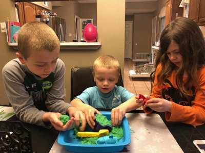 [This review was collected as part of a promotion.] I was chosen to receive a free Kinetic Sand Sandbox Set to try in exchange for an honest review. I am actually pleasantly surprised by how long it kept my kids entertained and how easy it was to clean up. My kids (ages 4, 7, and 8) played for over an hour creating impressions in the sand and then flattening it out to start again. Naturally there was a mess but it was incredibly easy to clean up! They spilled some on our leather chairs and our tablecloth. For both I followed the instructions and used a bigger piece of sand to pick it up and it worked! I like that the sand doesn't dry out as well. We stored it in a baggie and they took it out again a few days later and it was just as fresh as when we opened the package. I would happily recommend this product to a friend and I would go buy more for my kids.