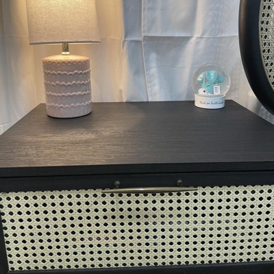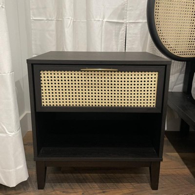 Buylateral Andros Night Stand with Faux Cane Drawer Front Black/Natural: Mid-Century Retro, Gold-Tone Handle, Rubberwood Legs