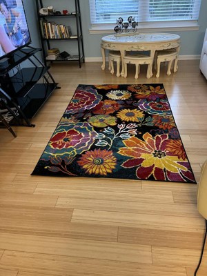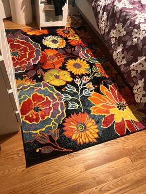 I bought this rug a little over a month ago and it is absolutely gorgeous. The colors are stunning and it is so soft. It seems to be well made. I love the way they blended the colors, it is hard to see in picture but they took the time to put different shades in the pedals of the flowers , not just a solid orange or one solid shade of blue. If you love color and flowers you’ll love this. It looks like a lot of black but it is not as much as the picture online more colorful.