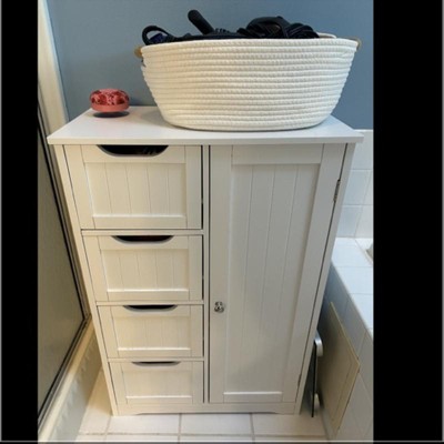 • This 22” L x 12” W x 32.5'' H cabinet has 4 no-handle sliding drawers and 1 roomy cupboard with an adjustable shelf. Once you have it, the storage space in your bathroom, kitchen, sitting room will be instantly expanded. Its clean-lined design with slatted paneling works well in a variety of aesthetics.