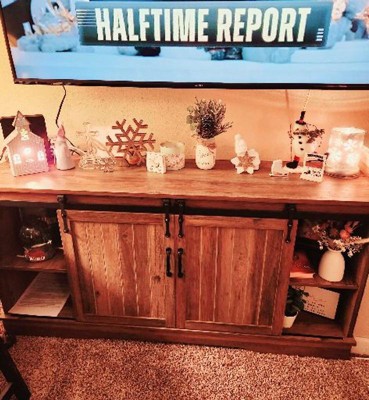 Taking into account both the functions of traditional TV stands and modern aesthetic and upgrading storage capacity, this TV stand comprises 6 storage cabinets and features an industrial-chic style. Appliances like a CD player, a sound box as well as various items like cups, tea caddies and gamepads can all be housed in a clean and ordered way.Besides, we replace traditional doors with sliding barn doors, more smooth, convenient, and flexible to use, meanwhile, adding a vintage vibe to your tasteful house.