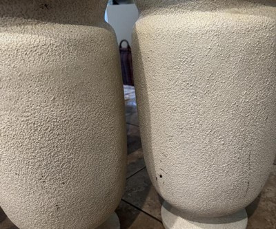 I love this planter. I was looking for the perfect planter for Audrey Ficus tree in my primary bedroom. This fit perfectly with the style of ny room, not too modern and not too traditional… justttt right haha. The outside is a creamy faux concrete type texture. I’d love this in other sizes too!