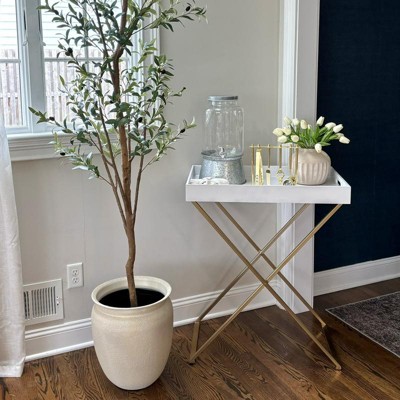 This pot is very large, but also slim enough that it won’t take up a ton of space. I’ve purchased outdoor pots from Studio Mcgee in the past, and I don’t think they hold up super well if not under a covered porch. I’m using this pot indoors and placed an already potted faux tree inside this planter to make it look taller and elevated.