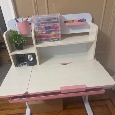 This is a great little desk with a lot of nice features at a very reasonable price! It’s a good size, even for older kids, and it looks great in my daughter’s room. She loves the pink details, and I love that the height can be adjusted as she grows. This was pretty easy to put together and seems sturdy.