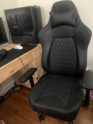 [This review was collected as part of a promotion.] This chair is very comfortable! Its so stylish and it feels like a real car seat as well! The assembly was a little difficult due to some screw holes came mis aligned but this chair is so worth it. It helps me align my back properly when I pull it back all the way and lay down. It also gives you a lot of room. I can criss cross apple sauce on it and I can adjust the arm rests. The pillow is comes with it also pretty comfortable!