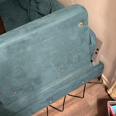 This sofa is a real treat! Quickly put together by my neighbor for me, it's a true teal in person. I would call it teal but my Mom says not teal, but that's the closest color she can think of. She says maybe peacock blue You decide! This photo was taken with new blackout curtains in full sun trying to figure out if I liked them, but I feel it's pretty accurate to the true color. The size was perfect for my smaller space and it is very comfortable. Here is what I wish I had been aware of from the listing. It is genuine suede! Not ultra suede or faux suede. That's fabulous and I was happily shocked were it not for my 2 cats... Also, the back pillows are feather pillows. This is my only letdown, again with the cats they require constant fluffing as the cats hop on the back of the sofa to get to their window perches. (I have now placed a quilt on the back of the sofa to protect the suede). If you are seated on the sofa you'll also have to do some heavy fluffing consistently. If not? Your suede will crease and look terrible! I was pretty surprised by this, and am looking into the cost of foam to replace the feather cushion inserts. I don't want my new sofa to look like a comfortably worn-in sofa, I want it to look crisp and brand new! I have no other complaints, those are just heads up really. We love this sofa and will love it even more with foam back pillow inserts (Costway are you reading? :-)