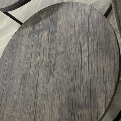 Nice tables for the price. Easy to put together (approx. 30 min). Tables are sturdy. I was expecting a wood top but it's more like a resin type material. It has a wood texture so it won't show water stains and prints - easy to clean.