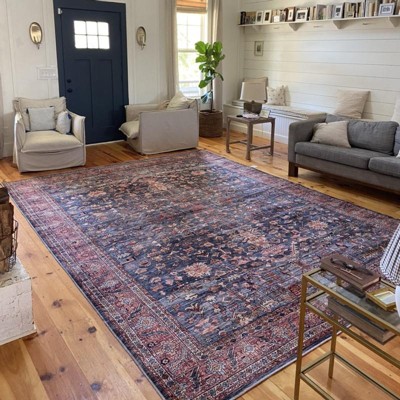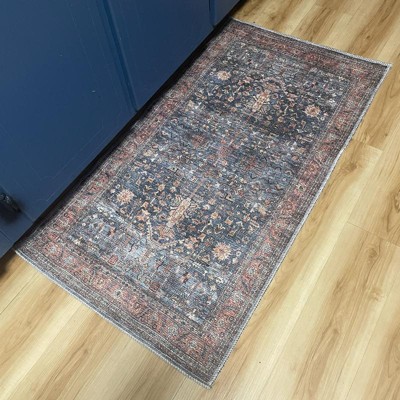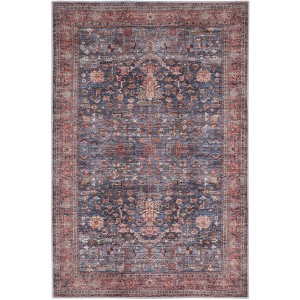 Bring the timeless appeal of yesteryear to your home with this washable rug from the Brilliance Machine Washable Collection. The richly saturated navy-blue ground is framed by a brick red border finished with a vintage wash that adds a subtle pop of color to your living room or bedroom. This printed Persian rug is thoughtfully designed for busy households, with a flatwoven pile and non-slip back that offers durability and easy cleaning without sacrificing style: simply toss into a washing machine. Perfect accent for the kitchen or bathroom.