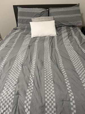 Artistically designed, this striped comforter set revitalizes your bed with bold style and refined comfort. The comforter features a contrasting clipped jacquard stripe design with a solid light gray reverse to create texture and dimension. Handsomely tailored matching shams and 2 decorative pillows provide the finishing touches to this expertly crafted casual bedding set.