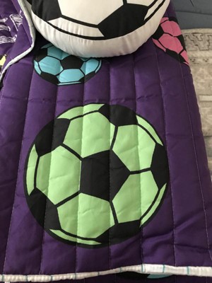 [This review was collected as part of a promotion.] There's a lot I love about this purple soccer quilt set for my daughter. First, it's not overly "girly" or frilly, if you know what I mean. She's a tough cookie and I wanted something that wasn't all pink and bubbles and giggly. This fit the bill. Then the little throw pillow and color scheme really bring it home. She loves sleeping with it. Who knows, maybe she's dreaming of that open field breakaway!!