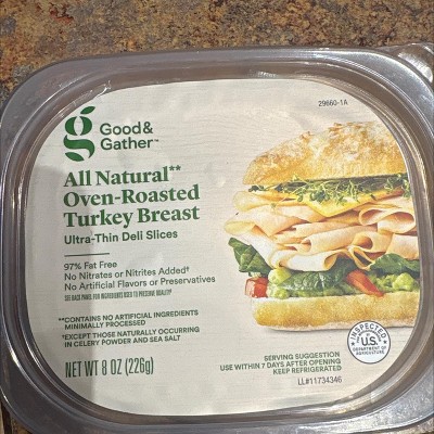 Craft delicious sandwiches, savory wraps and other go-to family favorites with this All Natural Oven-Roasted Turkey Breast from Good & Gather™. This turkey comes in ultra-thin deli slices that are delicious for enjoying with your favorite cheese, condiments and veggies, whether you place it between slices of bread, roll it up in a tortilla, or enjoy on salads and more. This turkey deli meat is 97% fat free, is minimally processed with no artificial flavors or preservatives,* and has no nitrates or nitrites added except those naturally occurring in celery powder and sea salt.*See ingredient statement for ingredients used to preserve quality.