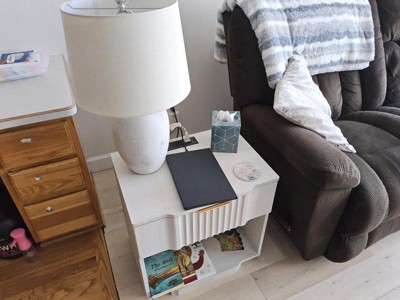 I bought two of these lamps in the off white color. One of the lamps was perfect, the other one was missing paint in an area. It happened to be in the front of the lamp. I had to send it back and am awaiting a replacement. I hope that it will not have any issues. I love the look of the lamp. I have it placed on a nightstand in my spare bedroom. It goes great and the color is very versatile.