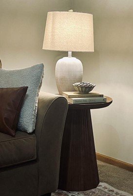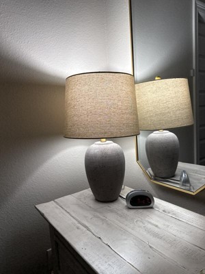 Bring natural warmth and rustic charm to your space with this ceramic table lamp, featuring a classic urn silhouette and purposefully distressed finish. The neutral tone enhances its versatile appeal, while the tapered linen shade softly diffuses light for a cozy ambient glow. Ideal for bedside tables, entryways, or living rooms, it complements farmhouse, rustic, and transitional décor. Uses a standard Type A bulb (not included) and is also compatible with LED equivalent wattage bulbs.