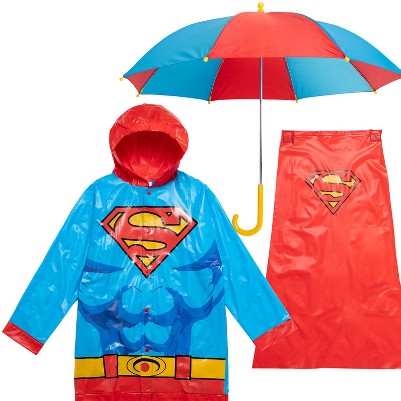 DC Comics Waterproof Rain Jacket, Cape and and Umbrella 3 Piece Outfit Set