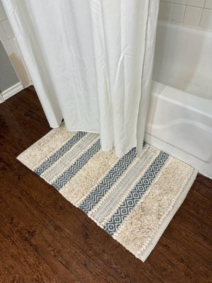 [This review was collected as part of a promotion.] I was gifted this rug by INK & IVY in exchange for my honest review. This rug is a great size and shape for the bathroom. It is rectangular and fits perfectly in front of the shower or the bathtub entrance. In our home, we put it in front of the shower entrance and it looks great! I love the blue and cream colors and the print is different, but not too unique to a point where it is hard to match with existing decor. I love the texture of the rug. It's very soft and has raised areas that are extra plush. It feels great on bare feet when stepping out of the shower. It doesn't slip on our hardwood floors, which is great! If you're looking for a soft rug for your feet, this is a great selection that also looks beautiful in a bathroom!