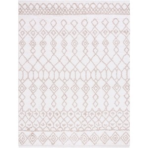The rug's beige and ivory hues create a serene foundation for your space, with a pattern that showcases a harmonious blend of shapes and textures reminiscent of timeless Moroccan designs. The combination creates a subtle yet impactful design, adding a touch of elegance to any room.