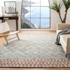 The rug showcases an intricate pattern combining harmonious shades of green and red, creating a visual feast for the eyes. The distinctive design boasts a symmetrical array of diamond shapes, each bordered with delicate lines and filled with smaller geometric motifs, evoking a sense of balance and sophistication in your living space.