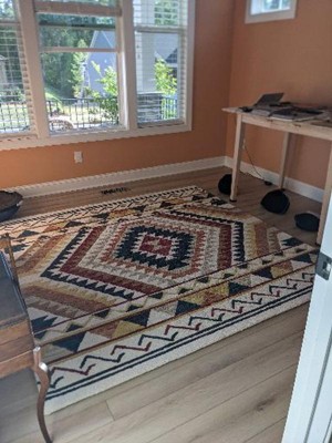 I bought this rug to go with my Southwest theme reminding me of Arizona. The rug has body and yes, a little heft. But that weight is good when you roll it out and it barely has a curve or a wrinkle. The colors are vibrant, the pile is tight. It feels great underfoot. It will dominate your space so let it be the prominent design piece. Vacuum it in both directions to remove stray threads. There weren't many which leads me to believe that it's a good quality. This is my first purchase with this brand, but not my first purchase of rugs through Target. I'm always impressed with the quality of rugs that I've purchased through Target.