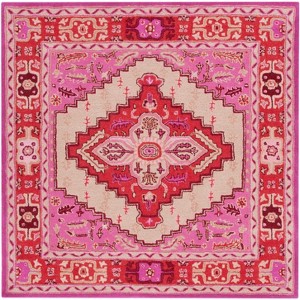 Discover the perfect centerpiece for your space with our handcrafted 7' X 7' Square area rug. Vibrantly designed in rich hues of red, pink, and ivory, this rug brings an air of regal elegance to any room. The square shape perfectly fits in harmony with any symmetrical setting or as a striking contrast in a more eclectic environment. Meticulously tufted by hand in India, this woolen masterpiece boasts a comfortable 3/8" pile height that invites you to step on and feel the plush warmth underfoot. The luxurious wool construction not only ensures durability but also provides a soft texture for years of enjoyment. The traditional design, expertly portrayed in the image provided, features a symmetrical pattern with a central floral medallion surrounded by intricate detailing and border work. The elaborate design symbolizes a confluence of classic beauty and artisan craftsmanship, ideal for bringing a refined touch to both modern and traditional interiors. Make a bold statement with this square area rug that marries the art of traditional rug-making with contemporary living spaces. Invest in timeless beauty and unmatched quality with our gorgeous hand-tufted wool rug, a piece that truly stands out as a work of art on your floor.