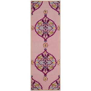 The rug features a delightful pattern that draws inspiration from traditional motifs, with a central medallion and surrounding a flora-esque symmetry, lending a touch of timeless elegance with a modern twist. The palette showcases a lovely pink backdrop accented with bursts of purple, blue, and subtle hints of yellow and teal, offering a dynamic visual appeal that's sure to captivate and complement a variety of interior decors.