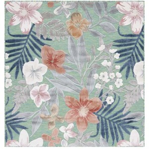 Elevate your living space with the timeless charm of our 7'-10"x7'-10" Square Area Rug. Brimming with natural allure, this rug is a stunning canvas of green and rust hues, artfully combined to create a serene outdoor essence for any indoor or outdoor setting. The intricate bloom and foliage pattern showcases a mix of refreshing botanic appeals that effortlessly enhances any room or patio.