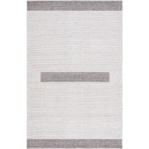 The design of this rug showcases a clean, minimalist pattern. Broad, horizontal bands of brown gracefully accent the creamy ivory base, creating a balanced visual harmony that's both bold and understated.