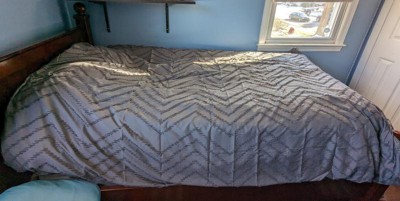 The Blue Peace Nested Rifted Microfiber Comforter fits our king-sized bed beautifully! The color is deep navy, and I love the detailing of this tufted comforter, as the pattern is neutral, simple and flattering! The thickness is somewhat less than I anticipated; however, this comforter has kept us warm and comfortable in the NY winter. I enjoy the breathability of this product and the overall appearance!