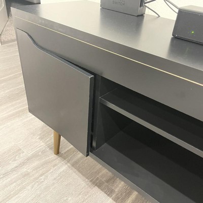 The tv stand is a great size. It’s the ideal length from the floor, and my 55” inch tv had enough space on both ends of the stand. It wasn’t difficult to assemble, however, it would’ve been better if more holes were “pre-drilled” to assist with the process. The style is modern and chic, good for a small living space. The main complaint I have is the smell. I don’t know if it’s the paint, the exposed wood, or something else, but the item had a very pungent, chemical smell to it that just wouldn’t go away. Also, the legs aren’t very sturdy and can loosen easily. Overall, it’s a nice product.