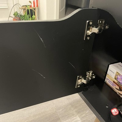 First delivery came literally split in half and completely damaged. Then when we finally got the second delivery, a lot of pieces were chipped and scratched. The quality is absolutely terrible. Super cheap for an entertainment center so I didn’t expect much. But this is beyond what I would’ve ever thought. Building: Poor instructions Pieces not labeled There are no pre-drilled holes so it makes everything ten times more difficult. Some of the hardware was too damaged to even use. (We tried using it anyways and now the door won’t close properly : picture below). Also the top piece and the lip do not align perfectly leaving a gap that shows the interior brown part. I know it doesn’t look like it but these pictures were taking right after building it and we were extremely careful to not scratch or scuff it up while we built it. It simply just came looking like this.