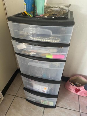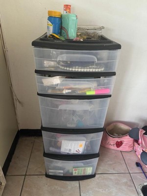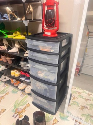 Homz Plastic 5 Clear Drawer Medium Home Closet Organizer Storage Container Tower with 3 Large Drawers and 2 Small Drawers, Black Frame