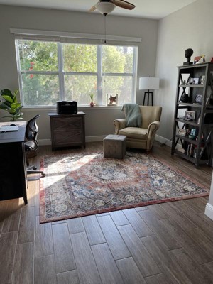 I looked for months for a nice rug that would fit in our room and still look good next to our open concept great room/dining/kitchen and blend well with the other colors. This rug has muted colors but doesn’t look faded and has a nice soft pile. The room now looks so cozy!