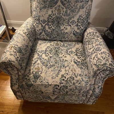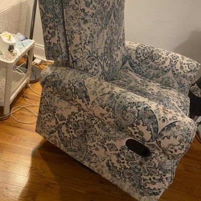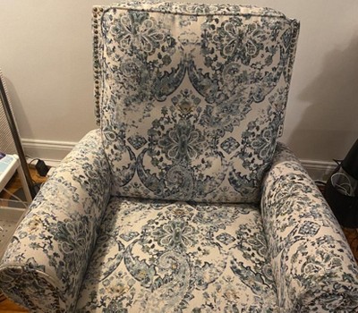 I really like this recliner. It is a beautiful design and something different from the other boring monotone ones. It’s comfortable, swivels well etc. BUT when you pull the lever to get the bottom part out, it yanks the entire chair and I always get a jump scare. It’s also loud when it does it. Not ideal for putting baby to sleep, which is what I got this for . But I would stilll recommend. I attached some pictures - I know those are helpful when there are no other reviews