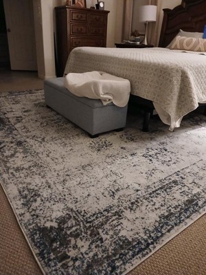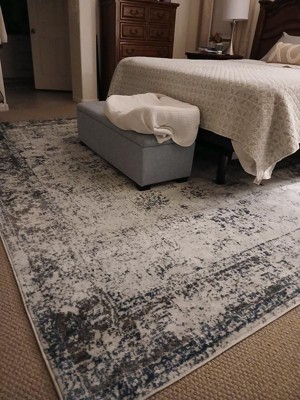 It depends on the time of day you take the picture, but the blue is definitely blue! It was hard for me to tell in pictures on the listing if it was gray with blue accents but the rug is indeed a light blue all around. It is very pretty. Looks more gray in the daylight, but is a true light blue, which matches my gray walls, that also seem to change color! Ha I purchased an 8x11. Some creases, but the picture is immediately after unfolding. Nothing a little air time can’t fix. You can’t beat the price!