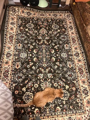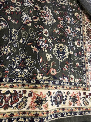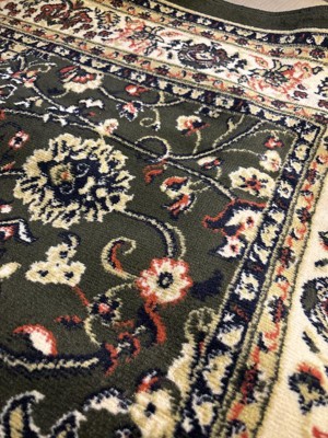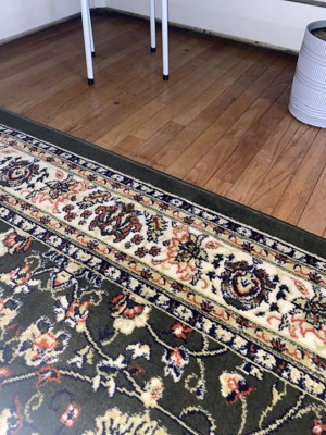 This Oriental design olive green rug will match the dark green leather couch in the living room. Good quality.