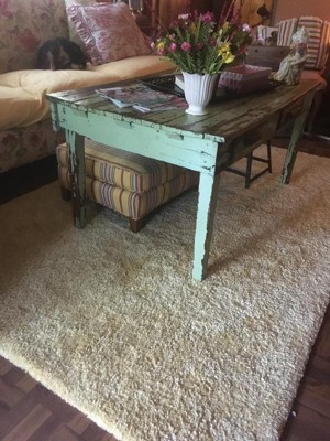 The rug is just as shown. Calm yellow tone, thick and comfy to walk in. I have a wool allergy, so its nice to find a thick fluffy rug that's not wool. My only concern is that I worry it will be hard to keep clean bc its so thick (but that's what you get with a fluffy rug).