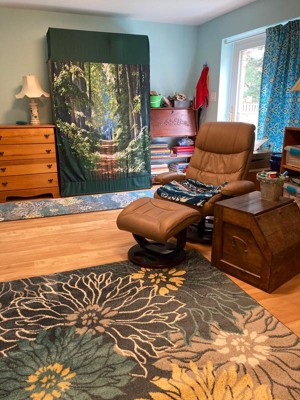 I wanted to replace a red 9 x 12 area rug with a blue one in my living room to align closer with a coastal theme in my home. I also have floral artwork on the walls, so a floral design fits. My first replacement rug purchased was cream with a blue/red design, but that rug smelled and wouldn't lie flat after weeks. It also didn't pop against my light vinyl flooring, so I returned it. I'm happier with the color and design of this navy/ivory rug. It's thicker than my original rug but still benefits from the pad that I bought separately. It feels okay beneath bare feet. I took off one star because it is still a bit creased a few days after unrolling it--I'm hoping it will smooth out eventually. I appreciate the instructions included to smooth out the creases.