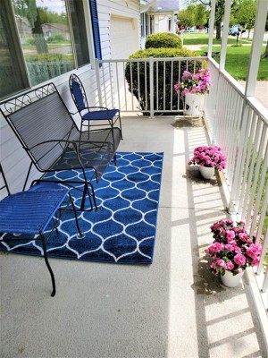 I waited to review my Lattice Frieze Rug until several weeks & different weather conditions had passed. I love it! The rich blue color hasn't yet shown any evidence of fading, although hot summer hasn't yet struck us here in central Ohio (my experiences with rich blue indoor carpets do, however, include fading). Rain hasn't appeared to affect it either. I refer to it now as the "star of my front porch."