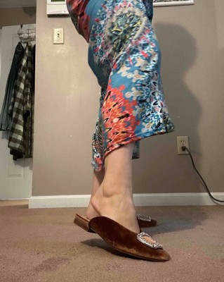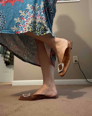 I tried on these flats in size 7 and a half. These shoes are really so beautiful. From the soft, brown velvety exterior to the bedazzled, large buckle, this mule well take your outfit up a notch. Unfortunately, they were not as comfortable as I was hoping. The top of the toe is squared off so that is part of the issue for me. Also, when walking, they were uncomfortable on the top of my foot as well. This item Felt true to size and the width Felt true to width. I received an incentive to write this review.