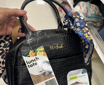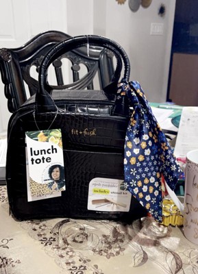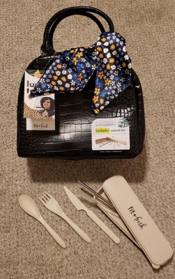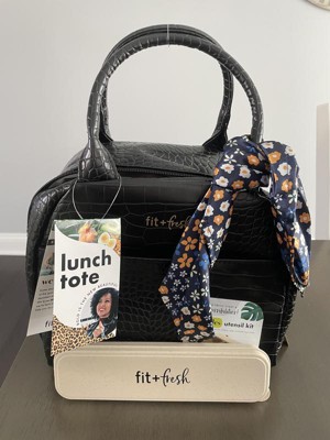 [This review was collected as part of a promotion.] I received the Fit + Fresh Lyon Faux Croc Lunch Bag. I love this bags look. It is a black faux croc leather material and very easy to wipe clean inside and out. It is well made and stylish. It comes with a cute removable small scarf that is tied to the handle. There is one pocket in front. The pocket is big enough for me to hold my utensils or what ever you feel like putting inside. One thing I did not care for is the lunch bag does not open all the way. I wished the zipper went back more to make it easier to put items inside. This lunch bag came with a utensil kit that is wonderful. The kit is reusable and comes in a nifty covered container. The utensil kit is made from wheat straw and BPA free which is fantastic. The utensil kit includes a spoon, knife, fork, metal straw with a straw cleaner. Lastly I love that the company's products are designed by women for women.