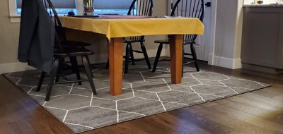 I bought the 8x8 dark gray and it looks great in our dining room on the hardwood. Love that the pattern is perfectly centered on rug.